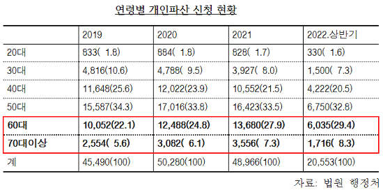 문제는 60대 이상 고령층 파산이 크게 늘고 있다는 점이다. 개인 파산 신청자 중 60대 이상 비중은 코로나19 직전이었던 2019년 말 27.7%에서 올해 상반기 말 기준 37.7%로 10%포인트 상승했다.