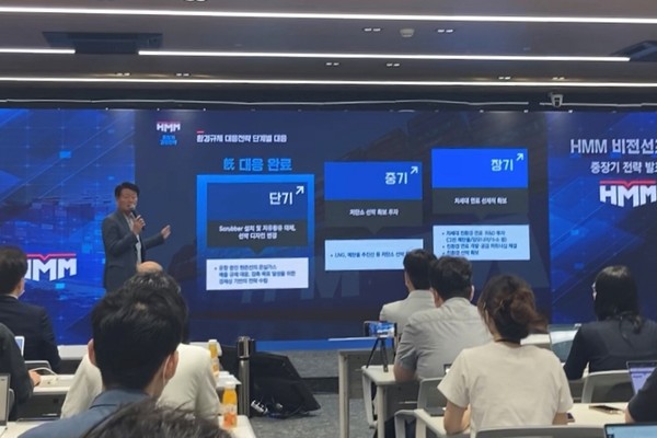 이날 여의도 본사에서 개최된 중장기 전략 설명회에는 김경배 HMM 대표이사를 비롯해 임직원 100여 명이 참석했다.