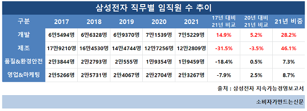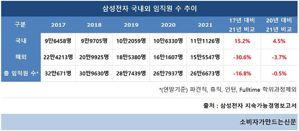 삼성전자 지속가능경영보고서에 따르면 최근 5년간 전체 직원 수는 감소세에 있다. 2018년까지만 해도 30만 명 이상이었으나 2020년과 2021년은 26만 명 수준에 그친다.