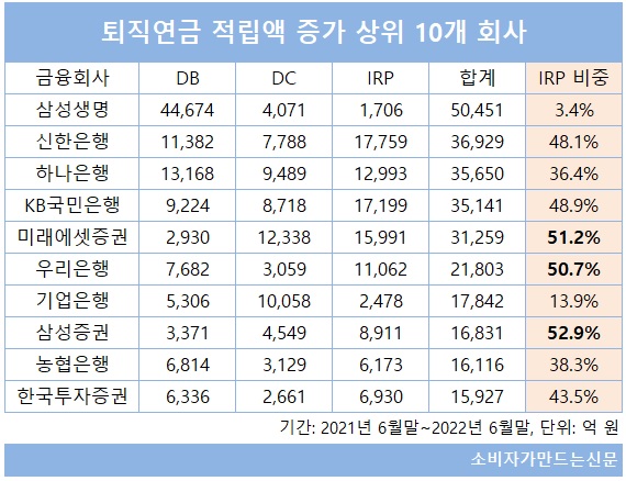 금융회사 퇴직연금 누적 적립금 상위 10개사 중에서 삼성증권과 미래에셋증권, 우리은행은 적립금 증가액 중 절반 이상이 IRP에서 발생했다.