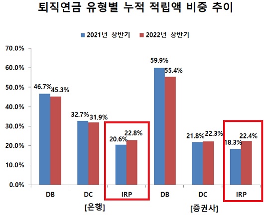 올해 상반기 말 기준 은행권 퇴직연금 적립액에서 IRP가 차지하는 비중은 전년 대비 2.2%포인트 상승한 22.8%를 기록했고 증권사는 같은 기간 4.1%포인트 오른 22.4%였다.