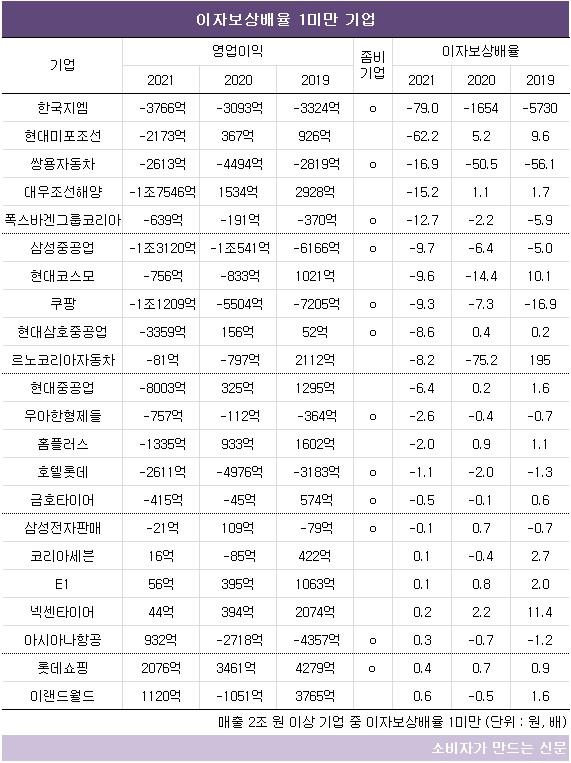 특히 롯데쇼핑을 비롯해 한국지엠, 쌍용차, 폭스바겐그룹코리아, 삼성중공업, 쿠팡, 현대삼호중공업, 우아한형제들(대표 김범준), 호텔롯데(대표 안세진), 금호타이어(대표 정일택), 삼성전자판매(대표 이평우), 아시아나항공 등 12곳은 3년 연속 이자보상배율이 1미만인 좀비기업이다.