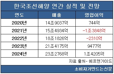 에프앤가이드는 내년에는 수주 실적이 반영돼 한국조선해양의 연간 실적이 흑자로 전환될 것으로 전망하고 있다. 한국조선해양 측 역시 빠르면 올해 3분기부터 흑자로 전환될 것이라며 기대감을 드러냈다.