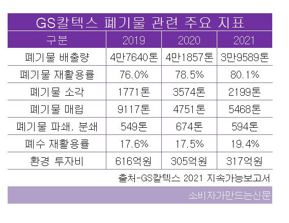 환경투자 비용이 줄어든 가운데 재활용률을 높이며 만회하고 있다. GS칼텍스는 2019년 환경투자 비용이 616억 원을 기록했다가 2020년 305억 원, 지난해 소폭 증가한 317억 원으로 규모가 줄어들었다. GS칼텍스는 2020년 코로나19로 인한 저유가와 정제마진 약세로 영업손실 9192억 원을 기록하는 등 찬바람을 맞은 바 있다.