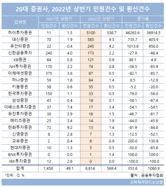 활동계좌 10만 건당 민원건수를 의미하는 환산건수는 569.4건으로 전년 동기 49.1건 대비 11배(1061%) 급증했다. 상반기 환산건수는 각 증권사의 1분기와 2분기 건수를 단순히 더해 계산했다.