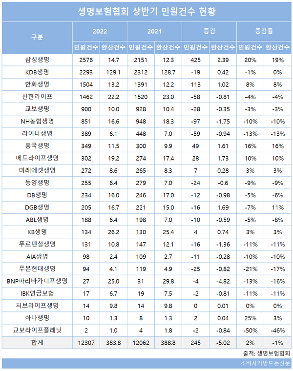 1일 생명보험협회에 따르면 올해 상반기 국내 23개 생명보험사의 민원건수는 1만2307건으로 전년 동기 1만2062건 대비 245건(2%) 증가했다. 보유계약 십만건당 환산건수는 383.8건으로 1%(5건) 줄었다.