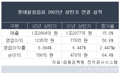 롯데칠성음료의 상반기 실적 선전은 음료와 주류 부문이 고르게 성장한 가운데 주류 부문 영업이익이 큰 폭으로 늘면서 전체 수익성을 견인하며 나타난 것으로 풀이된다.