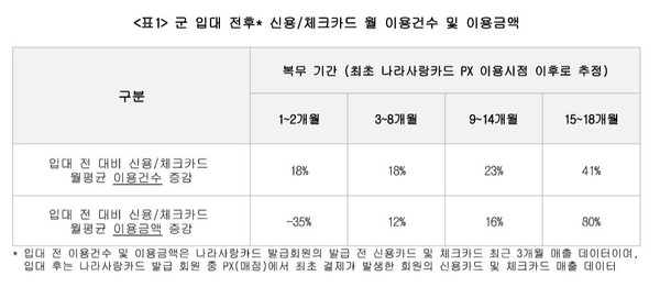 반면 3~8개월 시점에는 입대 전 대비 월 이용건수는 18%, 월 이용금액은 12% 증가했고, 9~14개월에는 건수 23%, 금액 16%가 증가했다. 15~18개월에는 월 이용건수는 41% 증가하고, 월 이용금액은 입대 전 대비 80% 증가하면서 제대를 앞두고 소비가 증가한 행태를 보였다.