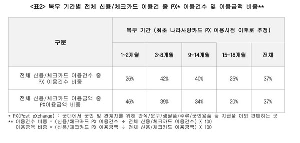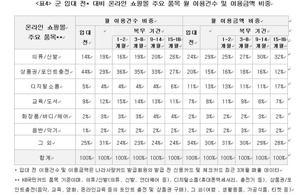 신용카드 및 체크카드 월 이용금액은 입대 후 3개월 이상부터 증가했고, 온라인 쇼핑몰에서 구매한 품목 중 의류·신발의 이용금액 비중을 복무기간별로 보면 3~8개월 27%, 9~14개월 30%, 15~18개월 32%로 복무기간이 늘어 날수록 증가했다. 이는 복무기간 경과에 따라 휴가 등을 사전에 미리 준비하기 위해 온라인 쇼핑 이용이 증가하는 것으로 추정된다.