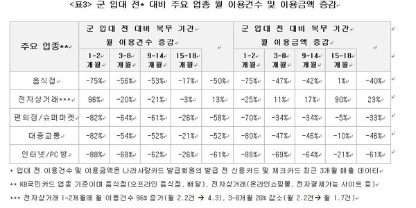 군 입대 전 대비 주요 업종 월 이용건수 및 이용금액 증감을 보면 복무 기간(18개월 기준) 중 음식점 업종의 월 이용금액은 40%, 편의점·슈퍼마켓 33%, 인터넷·PC방은 61% 감소, 군 입대 직후 시점인 1~2개월에는 음식점 75%, 편의점·슈퍼마켓 70%, 인터넷·PC방 업종은 88% 감소했다.