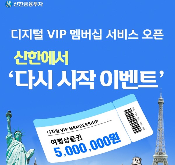 신한금융투자는 ‘디지털 VIP 멤버십 서비스’ 오픈 기념으로 ‘신한에서 다시시작 이벤트’를 10월31일까지 진행한다. 이벤트 기간 중 순입금고 10만 원 이상인 고객을 대상으로 매주 30명, 총 390명에게 스타벅스 아이스아메리카노 기프티콘을 제공한다.