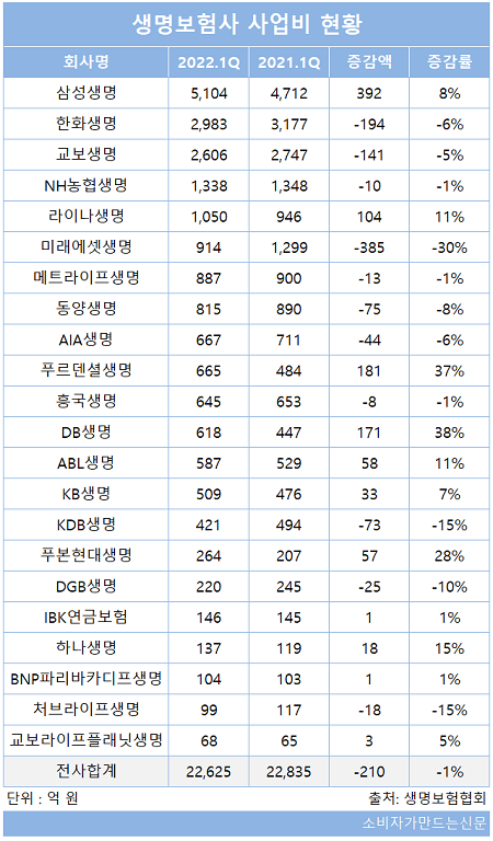 전체 생보사 사업비는 올해 1분기 기준 2조2625억 원으로 전년 동기 2조2835억 원 대비 210억 원(1%) 감소했다. 사업비 상위 보험사를 살펴보면 삼성생명과 라이나생명을 제외하고 모두 감소했다.