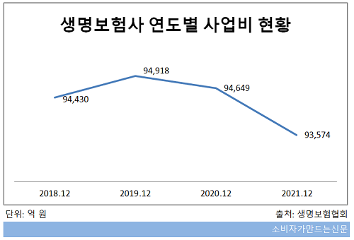 최근 생보사의 사업비는 감소추세다. 2018년 9조4430억 원에서 2019년 9조4918억 원으로 488억 원 소폭 증가했지만, 2019년 9조4918억 원에서 2020년 9조4649억 원으로 감소했다.