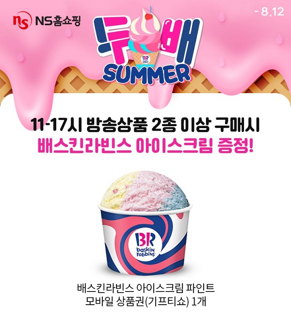 ‘두배 써머’ 프로모션은 평일 방송 상품 구매자를 대상으로 아이스크림 모바일 상품권 1개를 증정하는 이벤트다. 프로모션 기간 내 오전11시~ 오후 5시 편성된 TV방송 상품을 2종 이상 구매하면 ‘배스킨라빈스 파인트’ 모바일 상품권을 증정한다. 구매자 휴대폰 번호당 배스킨라빈스 기프티쇼 1개 증정된다는 게 업체 측 설명이다. 모바일 상품권은 휴대폰번호 당 1개씩 증정하고 8월 19일 금요일 대상자에게 일괄 발송하며 상품구매 취소 및 반품 시에는 대상자에서 제외된다.