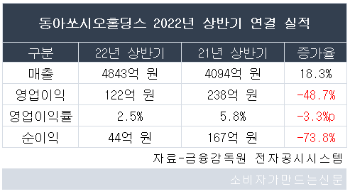 동아쏘시오홀딩스 측은 "주요 자회사의 고른 매출 성장으로 지주사 전환 후 분기 최대 매출을 2분기에 달성했다. 다만 원자재 가격 인상으로 인한 원가율 상승과 연간 매출 확대를 위한 마케팅 비용 집중으로 2분기 영업이익이 전년동기 대비 감소했다"고 말했다.