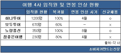 하나투어(대표 송미선·육경건)도 4월 전 직원 연봉을 3% 인상했다. 또한 현재 1200명의 임직원이 100% 복귀한 것은 물론 3년 만에 공개채용을 실시했다. 하나투어는 최근 62명의 신입사원의 교육을 마치고 업무 배치도 완료했다.