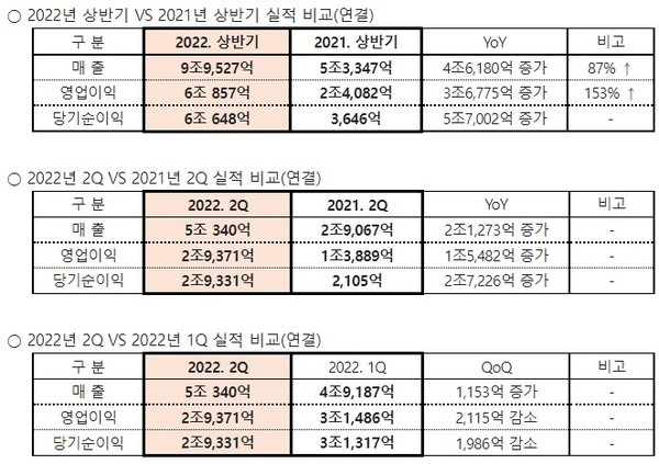 한편 2분기 매출은 5조340억 원, 영업이익은 2조9371억 원이다. 전년동기대비로 매출은 73% 증가했으며, 영업이익은 111% 증가했다.