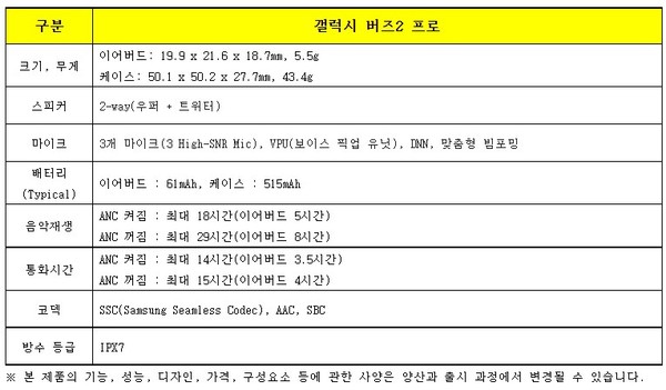'갤럭시 버즈2 프로'는 24 비트(bit) Hi-Fi 오디오를 통해 사용자에게 고품질의 선명한 사운드를 제공한다. 전작 대비 크기가 15% 작아져 편안한 착용감을 제공한다.