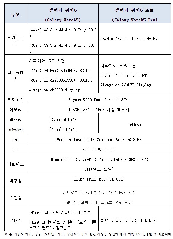사파이어 크리스탈을 더한 시그니처 원형 디자인의 '갤럭시 워치5'와 티타늄 바디, 향상된 GPS 성능으로 다양한 아웃도어 스포츠에 최적화된 '갤럭시 워치5 프로'가 출시된다. 또한 새롭게 아웃도어 사용성을 강화한 '프로' 라인업이 추가됐다.