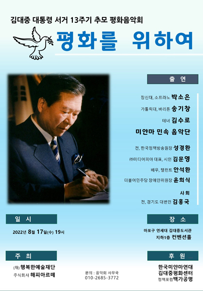 이번 음악회는 김대중 대통령의 서거 13주기를 맞아 그의 삶과 인생역정을 추모하고, 대한민국과 지구촌의 민주주의를 위해 헌신한 김대중 정신을 널리 알리고자 개최된다.