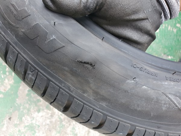 3주가 지난 무렵 고속도로를 달리던 중 타이어 이상을 감지하고 급히 IC를 빠져나와 차를 세우는 중 '펑'하는 소리와 함께 타이어 바람이 빠졌다. 확인 결과 운전석 앞 바퀴 옆면이 찢어져 있었다.