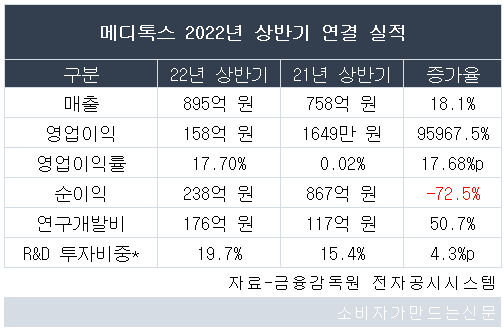 매출은 지난해 상반기보다 18.1% 늘고 영업이익은 약 961배(95967.5%) 늘었다. 앞서 메디톡스는 2019년 3분기 이후 7분기 만인 지난해 1분기 영업이익 흑자 전환에 성공했다. 지난해 상반기엔 1649만 원의 영업이익을 기록한 바 있다.