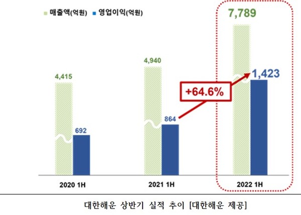 상반기 기준으로는 매출은 전년동기대비 57.7% 증가한 7789억 원, 영업이익은 64.6% 증가한 1423억 원이다. 이는 SM그룹 편입 후 상반기 기준 역대 최대 실적이다. 대한해운은 지난 2011년 기업회생절차를 거치고 2013년 SM그룹에 편입했다.