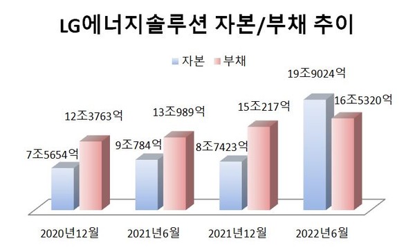 23일 LG에너지솔루션의 반기보고서에 따르면 상반기 부채비율은 83%다. 전년 동기(144.3%) 대비 61.3%포인트 줄었다. 분사 후 첫 반기 보고서를 제출한 2020년 12월(163.5%)을 시작으로 2021년 6월(144.3%), 2021년 12월(171.8%) 등 계속 세 자리 수 부채비율을 유지하다 올 상반기 처음으로 두 자리 수로 줄었다.