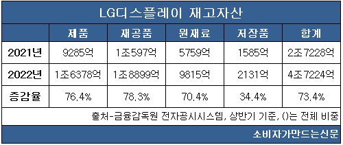 LG디스플레이의 재고자산은 상반기 기준 4조7224억 원으로 전년동기대비 73.4% 증가했다. 품목별로는 재공품(미완성품)이 78.3%로 가장 증가폭이 컸으며 제품(76.4%), 원재료(70.4%), 저장품(34.4%)이 뒤를 이었다.