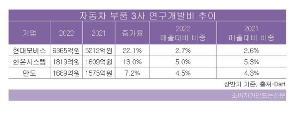 금융감독원에 공시된 자동차 부품 3사의 연구개발비 현황을 살펴보면 현대모비스가 6365억 원으로 가장 높았다. 이어 한온시스템(1819억 원), 만도(1689억 원) 순이다.