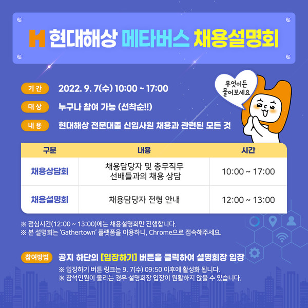 현대해상 채용관계자는 “현대해상에 입사를 꿈꾸는 지원자들이 별도 사전신청 없이 알찬 정보를 얻을 수 있는 기회인 만큼 많은 관심과 참여를 바란다”고 밝혔다.
