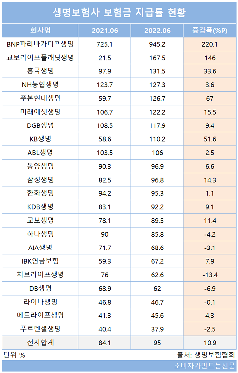 보험금 지급률이 가장 높은 곳은 BNP파리바카디프생명이다. 945.2%로 전년 동기 725.1% 대비 220.1% 폭등하면서 전체 보험사 중 지급률 증감폭이 가장 크기도 했다.