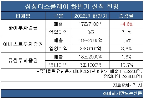 주요 증권사들은 삼성디스플레이의 하반기 실적도 흑자를 전망했다. 현재 경기 침체에 따른 가전·스마트폰 등의 수요 부진으로 디스플레이 업황이 둔화 중이고 경쟁사인 LG디스플레이가 하반기에도 적자 행진이 전망되는 것과 대비된다.