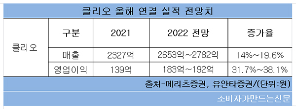 증권가는 클리오의 올해 연결 매출액 전망치는 2653억 원~2782억 원으로 전년 대비 14%~19.6% 오르고 영업이익은 183억 원~192억 원으로 31.7%~38.1% 오를 것으로 내다봤다.