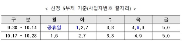 신청·접수과정에서 불편함이 최소화될 수 있도록 시행 초기 1달간 사업자번호 끝자리 기준으로 5부제를 시행할 예정이다. 다만 10월 3일과 10일은 공휴일임을 감안해 사업자번호 끝자리 기준 1, 6번 자영업자 등은 각각 화요일 및 목요일에 신청 가능하다. 신청 접수 후 대환대출 실행은 약 2주 정도 소요될 예정이다.
