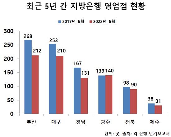 6월 말 기준 전북은행의 영업점 수는 90곳으로 5년 전 대비 8곳 줄었는데 기반 지역인 전북지역에서는 오히려 점포가 1곳 늘었고 기타 지역에서 9곳 감소했다. 광주은행은 같은 기간 오히려 점포가 139곳에서 140곳으로 1곳 증가했다. 광주은행은 기반 지역인 광주·전남지역에서 9곳이 늘었고 기타지역에서 8곳 감소했다.