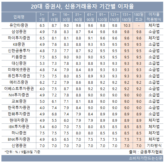 금융투자협회에 공시된 증권사 신용거래융자 이자율을 조사한 결과 유안타증권이 대출기간 151일에서 180일 사이일 때 10.3%로 가장 높았다. 삼성증권도 91일 기준 9.8%, 하이투자증권 91일 기준 9.6%에 육박했다.