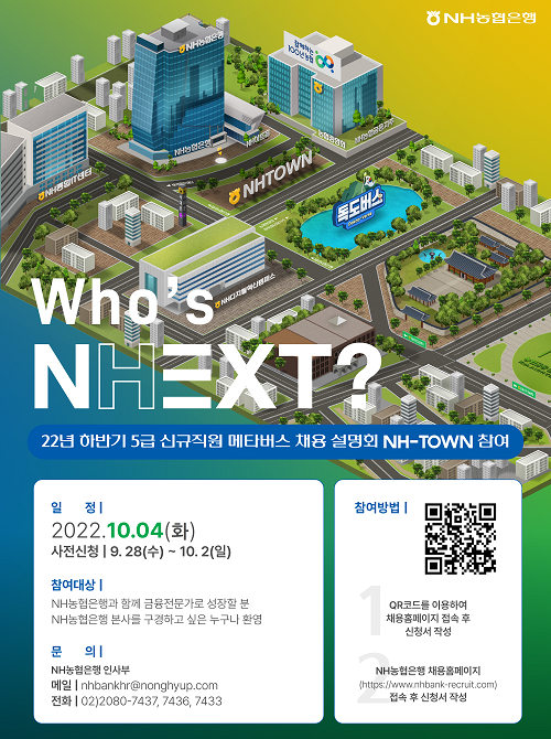 농협은행은 채용 메타버스 플랫폼인 'NH TOWN'에서 10월 4일부터 7일까지 회사 소개, 채용 정보 등 지원자들이 필요로 하는 다양한 콘텐츠를 제공한다고 밝혔다. 오는 4일에는 메타버스 채용설명회를 개최할 예정이다.