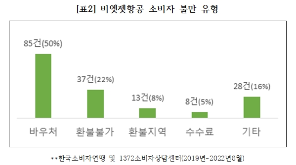 2022년 8월 말까지에 접수된 171건의 소비자불만을 유형별로 살펴보면 바우처 환불이 85건 50%를 차지했고, 환불 불가에 대한 불만이 37건으로 22%, 환불 지연 13건으로 7%, 수수료불만 8건 5%, 결항에 대한 손해배상 및 서비스 등의 기타불만으로 28건 16%로 나타났다. 실질적으로 소비자 불만의 대부분이 사용하지 못하는 항공권에 대한 환불 불가나 높은 수수료에 대한 불만인데 문제는 이러한 환불의 원인이 항공사에 있는 경우에도 소비자에게 피해를 떠넘기고 있다는 것이다.