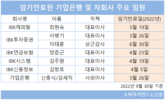 최현숙 IBK캐피탈 대표와 서병기 IBK투자증권 대표는 지난 3월 말 임기가 끝났지만 연임 여부도 결정되지 않고 6개월 넘게 임기를 연장하고 있다. 양춘근 IBK연금보험 대표, 김주원 IBK시스템 대표, 김창호 IBK신용정보 대표도 지난 4월에 나란히 임기가 끝났지만 후임 인선은 이뤄지지 않고 있다.