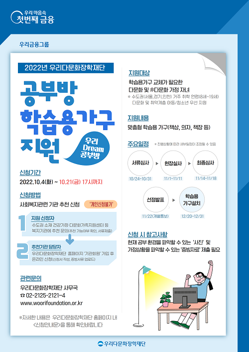 우리 드림 공부방은 아동·청소년의 쾌적한 학습환경과 건강한 성장을 지원하기 위해 우리다문화장학재단이 지난 2014년부터 시행 중인 공부방 환경 개선사업이다. 현재까지 총 145가구, 275명의 아동·청소년이 혜택을 받았다는 설명이다.