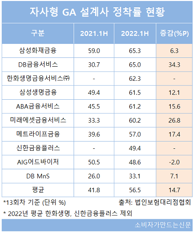 5일 법인보험대리점협회에 따르면 삼성화재금융서비스, DB금융서비스, 삼성생명금융서비스, ABA금융서비스, 미래에셋금융서비스, 메트라이프금융, AIG어드바이저, DB MnS 등 국내 8곳 자사형 GA의 13회차 기준 설계사 정착률은 56.5%로 전년 상반기 41.8% 대비 14.7%포인트 높아졌다.