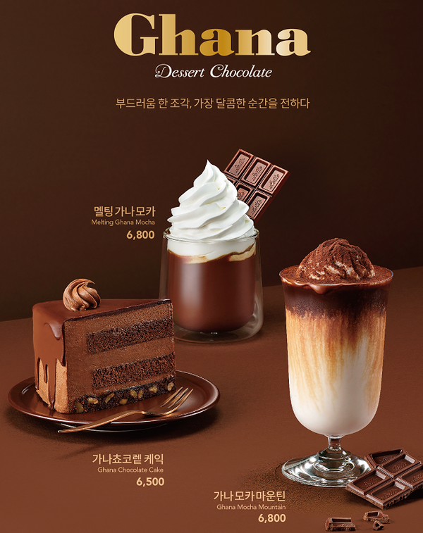 신제품 3종은 음료 2종과 케이크 1종으로 구성됐다. △가나초콜릿을 그대로 녹이고 초콜릿을 토핑해 한층 더 진한 초콜릿 맛을 느낄 수 있는 멜팅가나모카(6800원) △바닐라와 초콜릿 베이스의 스노우 제품에 코코아파우더를 산처럼 올린 가나모카마운틴(6800원) △초콜릿의 부드러운 맛을 즐길 수 있는 가나쵸코렡케익(6500원)이다. 오는 12월 31일까지 판매한다.