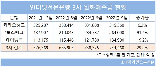 9월 말 기준 인터넷전문은행 3사의 원화대출 잔액은 43조6416억 원으로 전년 말 대비 10조1588억 원 증가했다. 9개월 만에 대출잔액이 30.3%나 늘었다.
