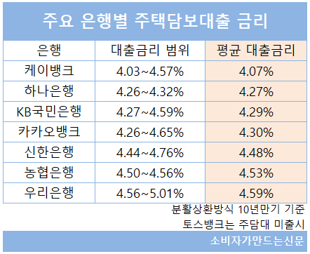 은행연합회에 따르면 지난 6일 기준 10년 만기 분할상환방식 주택담보대출 평균금리 기준 최저 금리는 케이뱅크가 연 4.07%로 가장 낮았다. 카카오뱅크도 평균금리 연 4.30%를 기록해 다른 시중은행보다 낮거나 비슷한 수준이었다.
