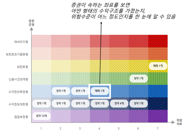 파생결합증권 통합정보플랫폼에서는 모든 공모 파생결합증권 정보를 제공할 예정이다. 증권유형을 7가지로 나누고 위험지표체계를 신규 수립한 뒤 색깔과 명도로 한눈에 비교할 수 있게 도식화했다.
