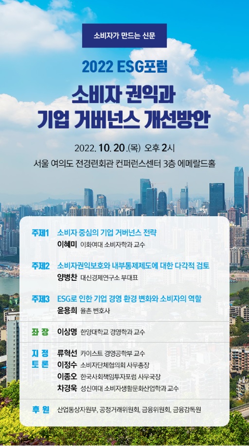 소비자가만드는신문은 산업통상자원부와 공정거래위원회, 금융위원회, 금융감독원 후원으로 오는 10월 20일 오후 2시 여의도 전경련회관 컨퍼런스센터 3층 에메랄드홀에서 ‘소비자 권익과 기업 거버넌스 개선방안’이라는 주제로 ‘2022 ESG포럼’을 개최한다.