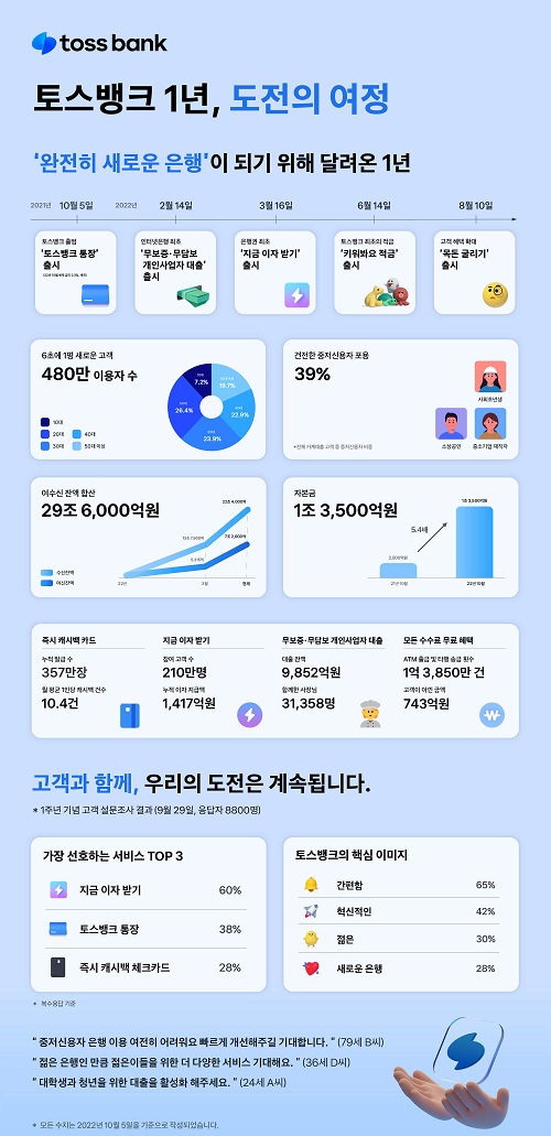 홍민택 토스뱅크 대표는 "토스뱅크는 제1금융권에 대한 기존의 고정관념을 사용자 관점에서 혁신해 나가며 많은 고객들을 포용할 수 있었다”며 "이를 성장의 밑거름 삼아 보다 넓은 고객층을 기반으로 포용에 기반한 혁신을 이끌어갈 계획이며 새로운 차원의 뱅킹서비스를 선보이는 은행으로 거듭나겠다"고 말했다.