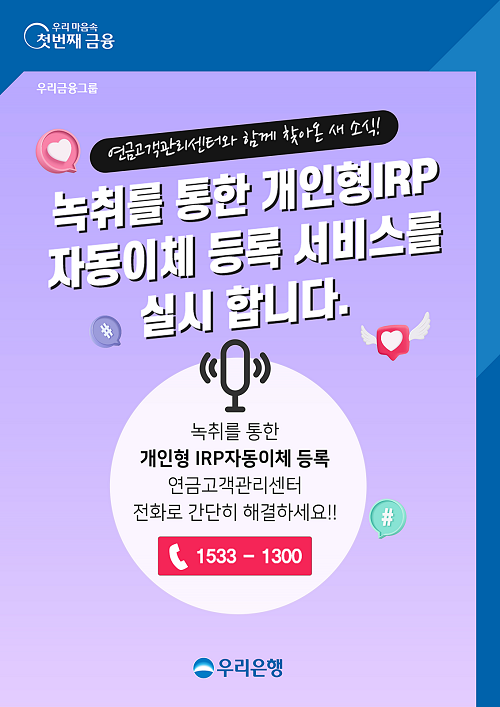 우리은행 관계자는 “점차 증가하는 비대면채널 이용고객을 위해 은행권 최초로 개인형 IRP 자동이체 녹취 간편등록 서비스를 도입했다”며 “앞으로도 은행 방문이 어려운 고객을 위한 편리성 및 만족감을 높일 수 있는 서비스를 다른 업무에도 지속적으로 확대할 것”이라고 말했다.