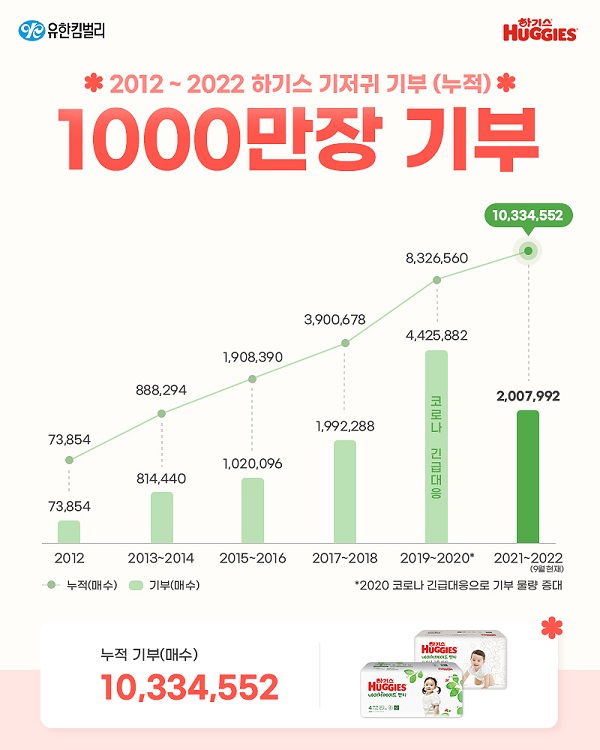 하기스는 저출생 기조 속에서 유아용품 1위 브랜드로서의 사회적 책임을 다하기 위해 2012년 ‘유한킴벌리 희망뱅크’ 기저귀 기부프로그램을 시작한 이후 이른둥이용 초소형 기저귀(소형) 캠페인 등 다양한 활동을 통해 기저귀를 제공하고 있다는 게 업체 측 설명이다.